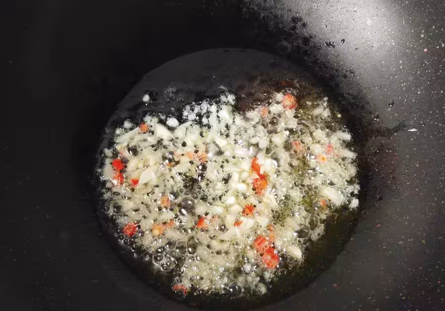 3.鍋中放入食用油,要想使紅薯葉顏色翠綠,我們可以在裡面加一點豬油,這樣炒出來的蔬菜口感會更好,放小米椒和一半的蒜泥進去爆香。