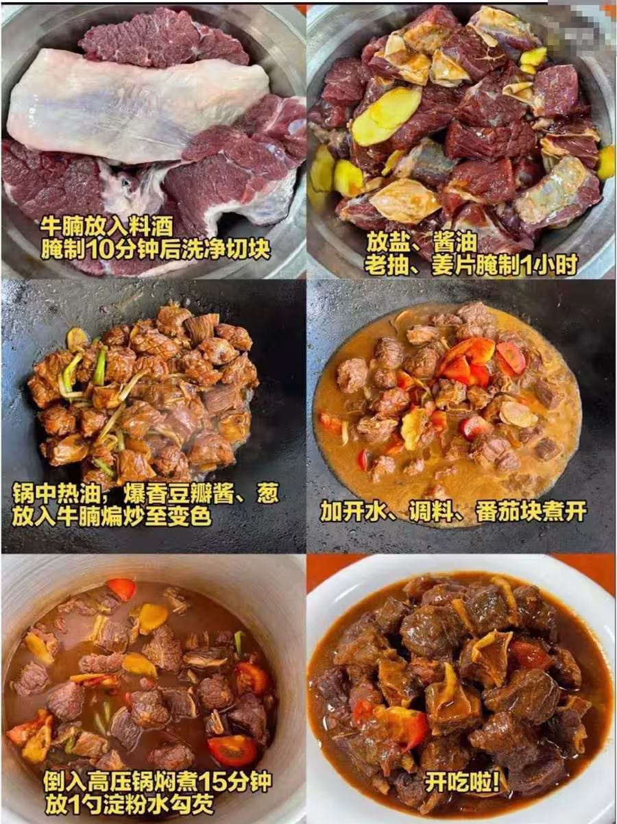 最後,將所有食材倒入高壓鍋中燜煮15分鐘。在這個過程中,高壓鍋的高溫使得牛肉更快地烹煮成熟,肉質變得更加軟嫩。同時湯汁也被牛肉和番茄充分吸收,濃郁的香味更加突出。倒入事先準備好的澱粉水勾芡,使湯汁變得濃稠,更加適合澆在飯上食用。