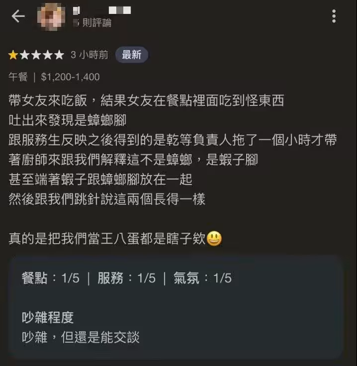 女友竟然吃到異物,拿出來仔細看,覺得跟蟑螂腳很像,立即向服務員反映,等了一個小時,員工帶著廚師到桌邊解釋「不是蟑螂,是蝦子腳,甚至端著蝦子跟蟑螂腳放在一起,然後跟我們跳針說兩個長一樣」。