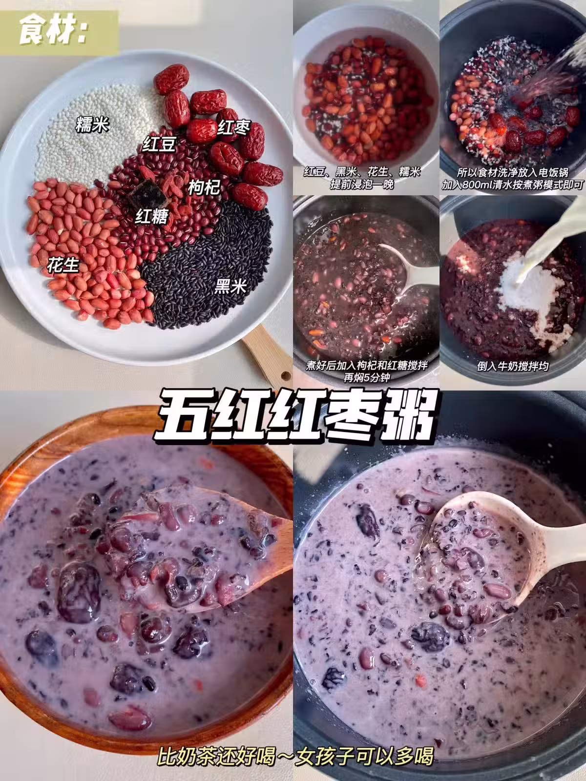 食料:糯米,花生,黑米,紅豆,紅棗,紅糖;枸杞;牛奶
