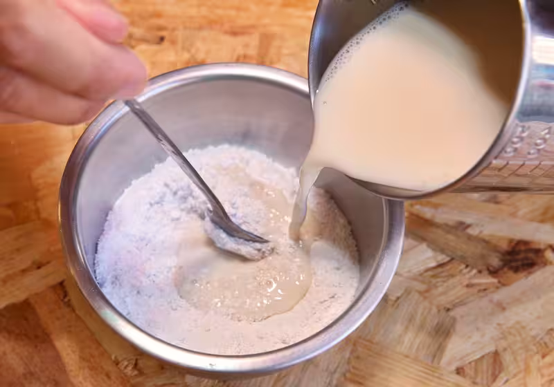 倒豆漿時務必慢慢倒入,較能均勻與粉攪拌成粉漿,若一次倒入,易造成粉、漿分離。
