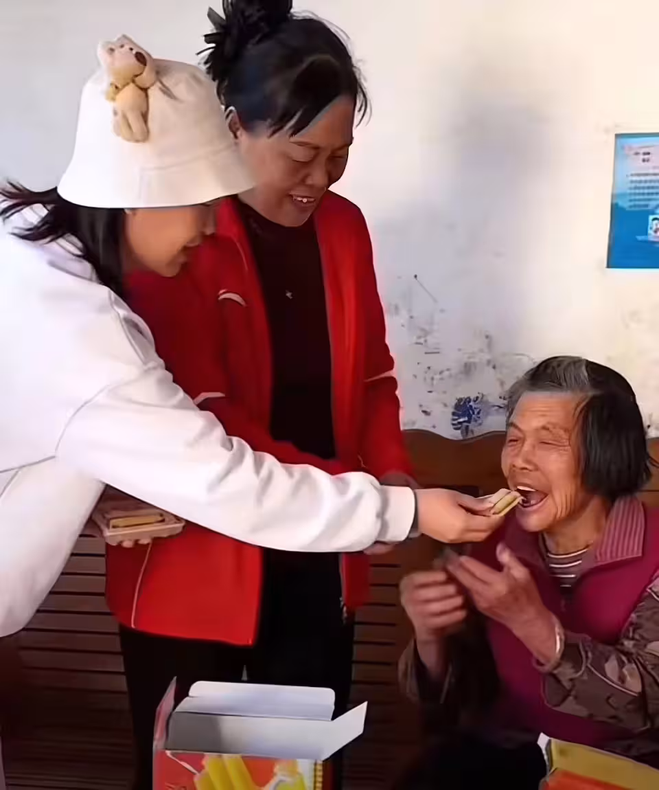 全紅嬋陪媽媽回娘家,穿白色運動套裝清爽洋氣,喂外婆吃糕點很孝順