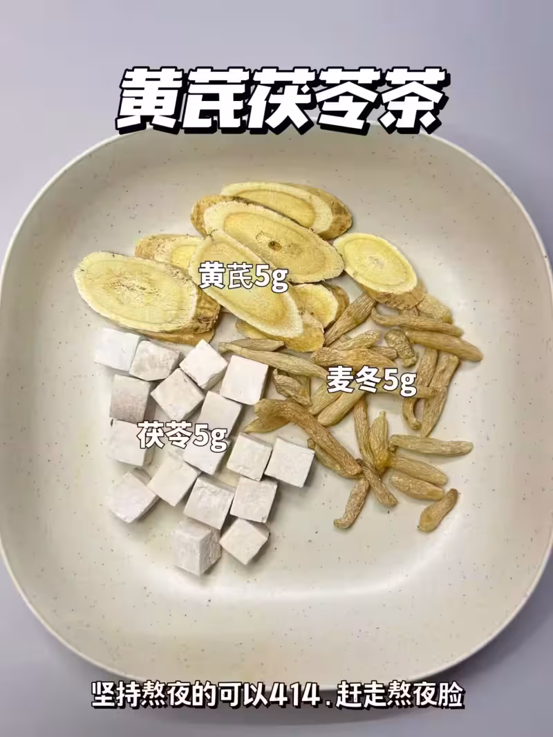 黃芪 5g,麥冬5g,茯苓5個(經常熬夜的可以試試,去濕氣,趕走熬夜臉)
