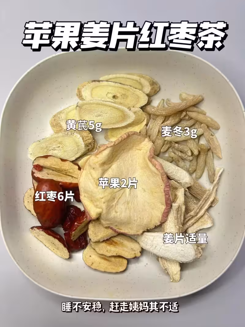麥冬3g,黃芪5g,蘋果2片,紅棗干6片,薑絲適量(睡眠不安穩的女生可以試試,趕走姨媽期不適)