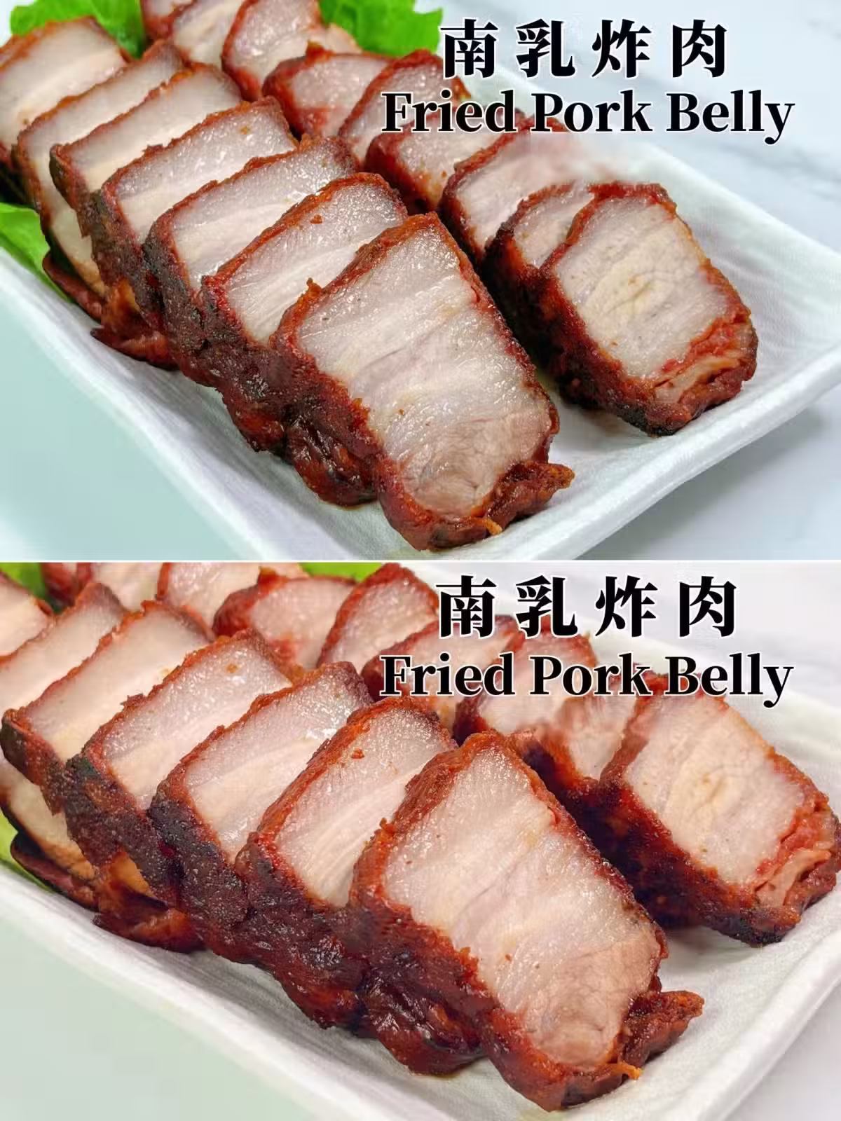 🥣 材料: 750克去皮五花肉。 2大勺生抽,2大勺紹興酒,1大勺糖,2大勺南乳汁,3塊南乳,適量薑片和蔥段。 75克玉米澱粉或紅薯澱粉。 ‼️ 1 大勺 = 1 Tbsp = 15 ml,1小勺 = 1 tsp = 5 ml