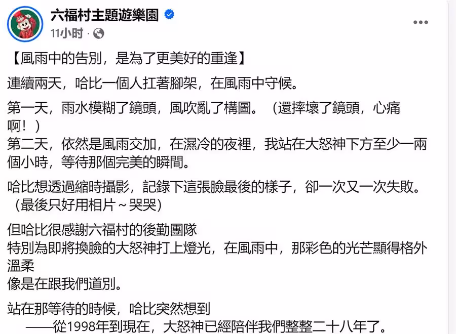 六福村人氣設施「大怒神」自1998年啟用以來,陪伴遊客整整28年,成為無數人童年與青春回憶的一部分。今(20日)六福村在官方臉書發文表示,為了讓大怒神以全新姿態延續精彩,園方將對其進行調整與維修,為這座17層樓高的經典設施「換臉」。消息一出,立刻掀起大量網友懷舊留言,感嘆「我的青春再見了」。