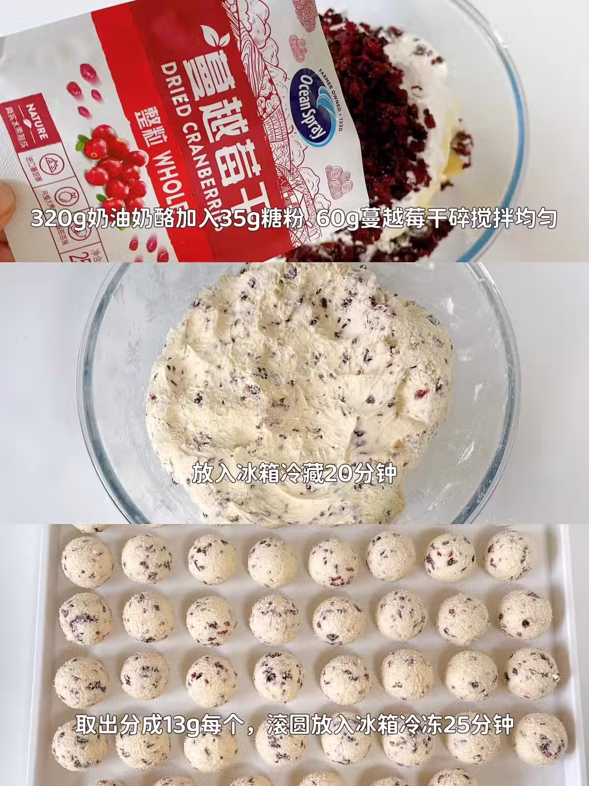 1、製作蔓越莓乳酪餡,奶油奶酪加入糖粉、蔓越莓干碎攪拌均勻,冷藏20分鐘,取出分成13g每個,滾圓放入冰箱冷凍25分鐘