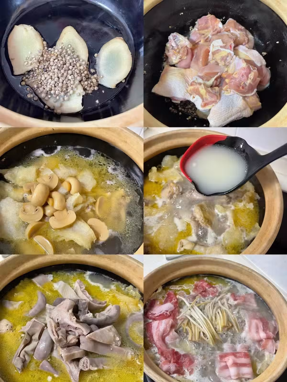 3)再把豬肚、豬腸、肉片、金針菇和少許之前煮豬肚的湯,開大火煮5-10分鐘。上桌前加入芹菜和調味料,調味即可。