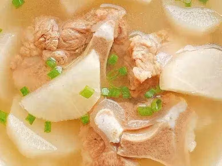 1、牛脊骨清洗乾淨,冷水下鍋焯水,放入料酒和薑片去腥,煮開後撇掉浮沫,再將牛脊骨撈起來清洗乾淨。白蘿蔔削掉外皮,清洗乾淨後切成小塊。