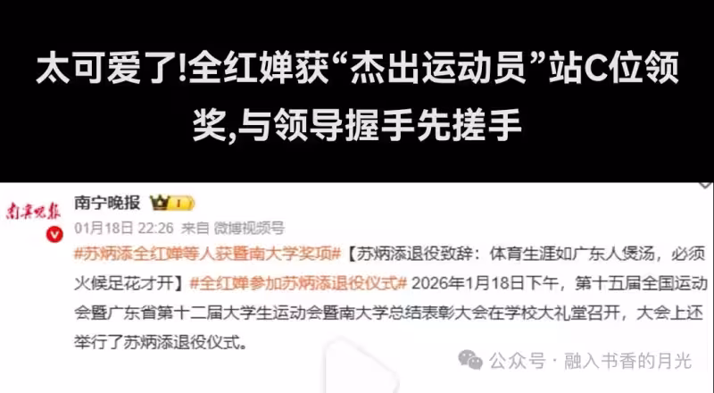 2026年1月18日下午,暨南大學在大禮堂召開第十五屆全運會暨廣東省第十二屆大運會總結表彰大會。該校2024級本科生、跳水名將全紅嬋榮獲2025年傑出運動員獎,與其他10名運動員一同獲此殊榮。全紅嬋暨大領獎頒獎現場的細節盡顯溫度與教養,暖心名場面頻頻刷屏。