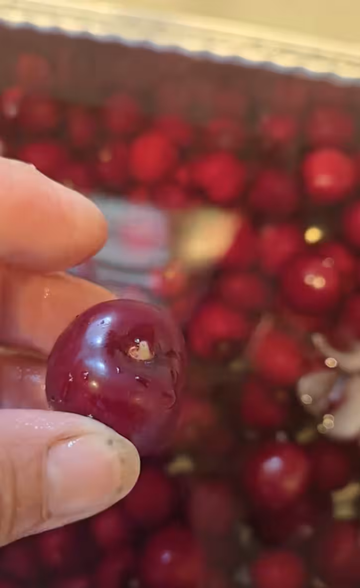 她將新採收的櫻桃放入加了冰塊的醋水中浸泡,沒想到竟然陸續有白色小蟲從果肉中爬出。