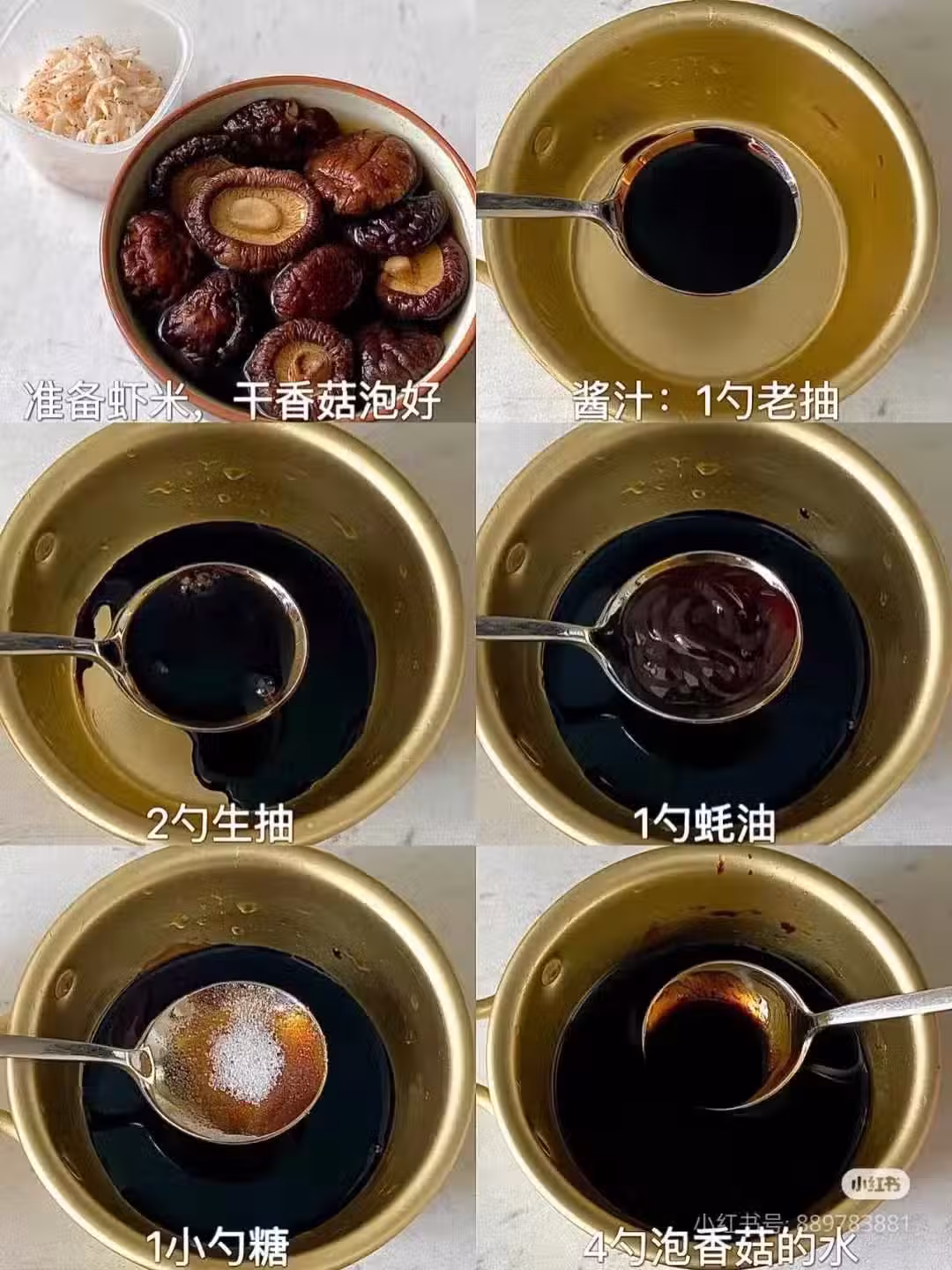 ❷先翻炒香菇和蝦皮,大概3分鐘左右;再倒入醬汁炒勻;