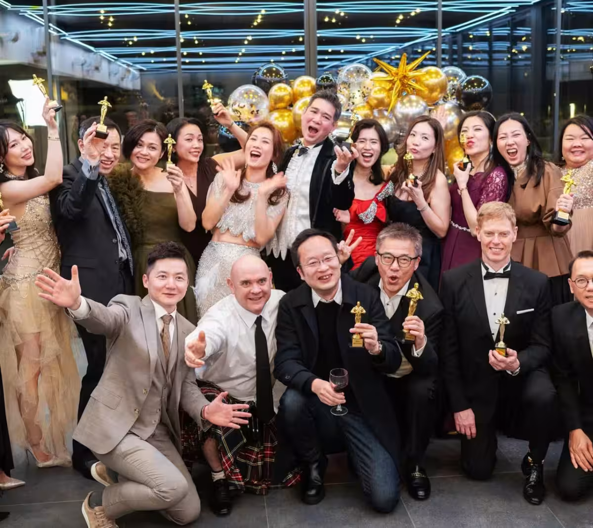 袁彩雲的這場生日派對大概有20多人參加,都是她與丈夫在當地的親友。大家都盛裝出席,女性穿了禮裙或是禮服,男性穿了西裝、禮服,還有一個男性外國人士穿了裙子,很有意思。在合照的時候,每個人手上都拿了一個小金人,袁彩雲與丈夫站在中間,夫妻倆都表現得極為興奮。袁彩雲的丈夫罕見露臉,他穿了禮服,系了領結,他的頭髮看起來已經花白了,不過依然帥氣有型,而且他的臉蛋泛紅,大概是因為開心喝了不少酒,袁彩雲挨著丈夫,雙手張開,十分開心。