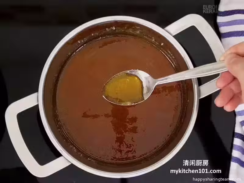 2)把白砂糖放入一個乾淨的鍋里,中小火炒至白砂糖轉變為深褐色。