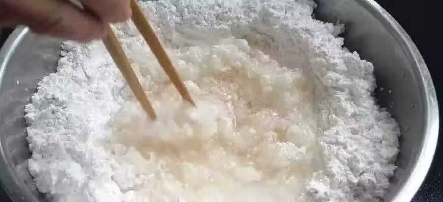 第七步:準備適量的木薯粉,裝到一個大盤中,邊倒入開水邊用筷子慢慢攪拌,一定要慢慢加開水哦
