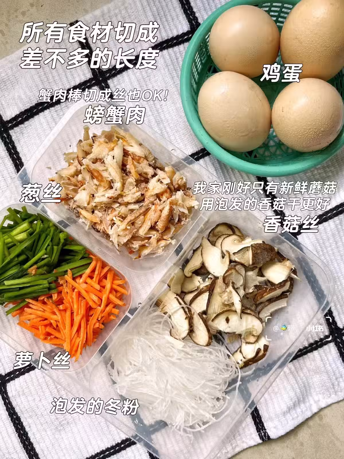 主材料:蛋、冬粉、香菇(要干香菇的香味才夠)、蟹肉棒(更能還原吃桌的口味)、胡蘿蔔、青蔥