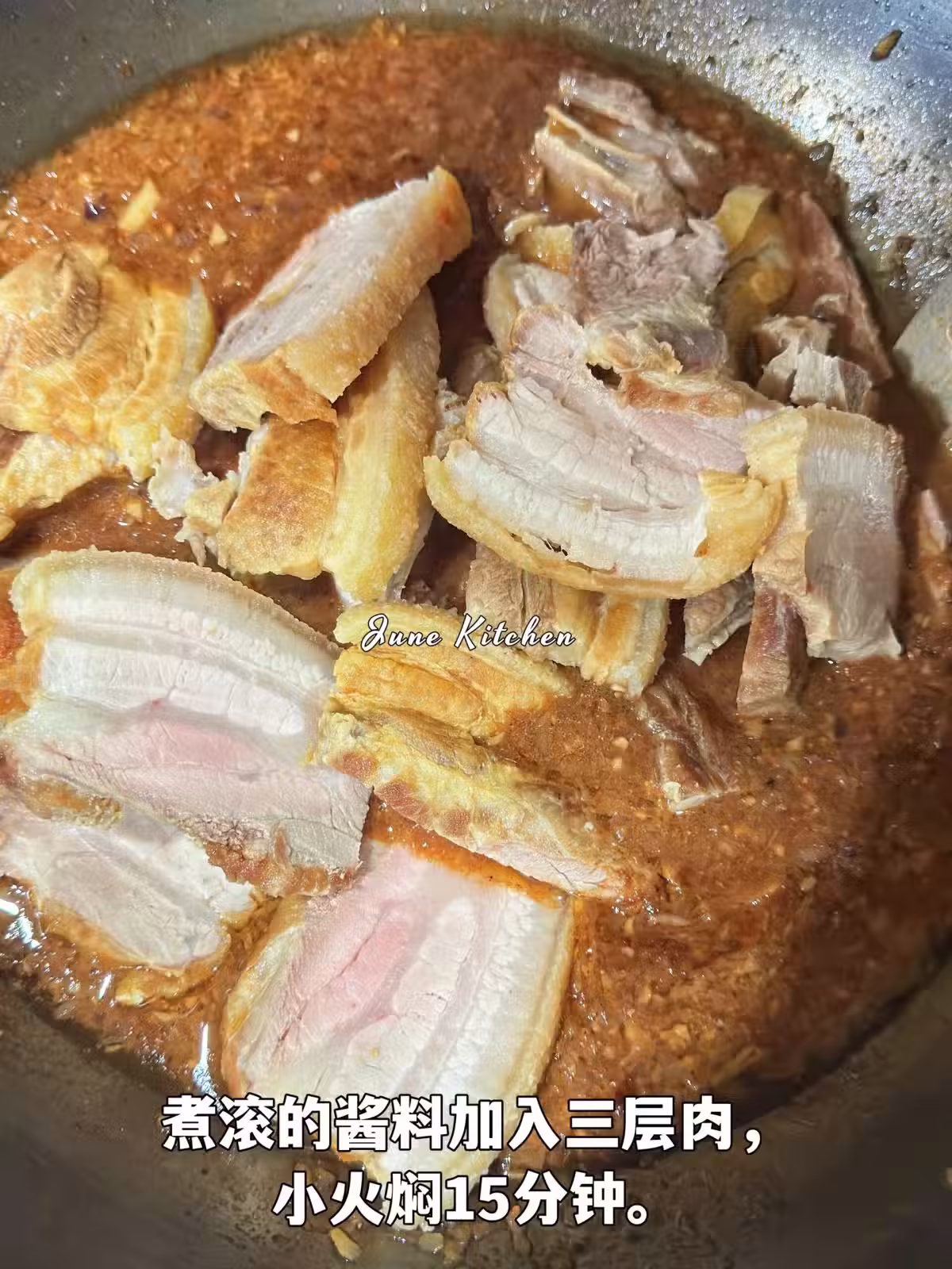 7️⃣燜好的肉片待涼,每片肉和芋頭都沾上醬汁,整齊排列在碗中。