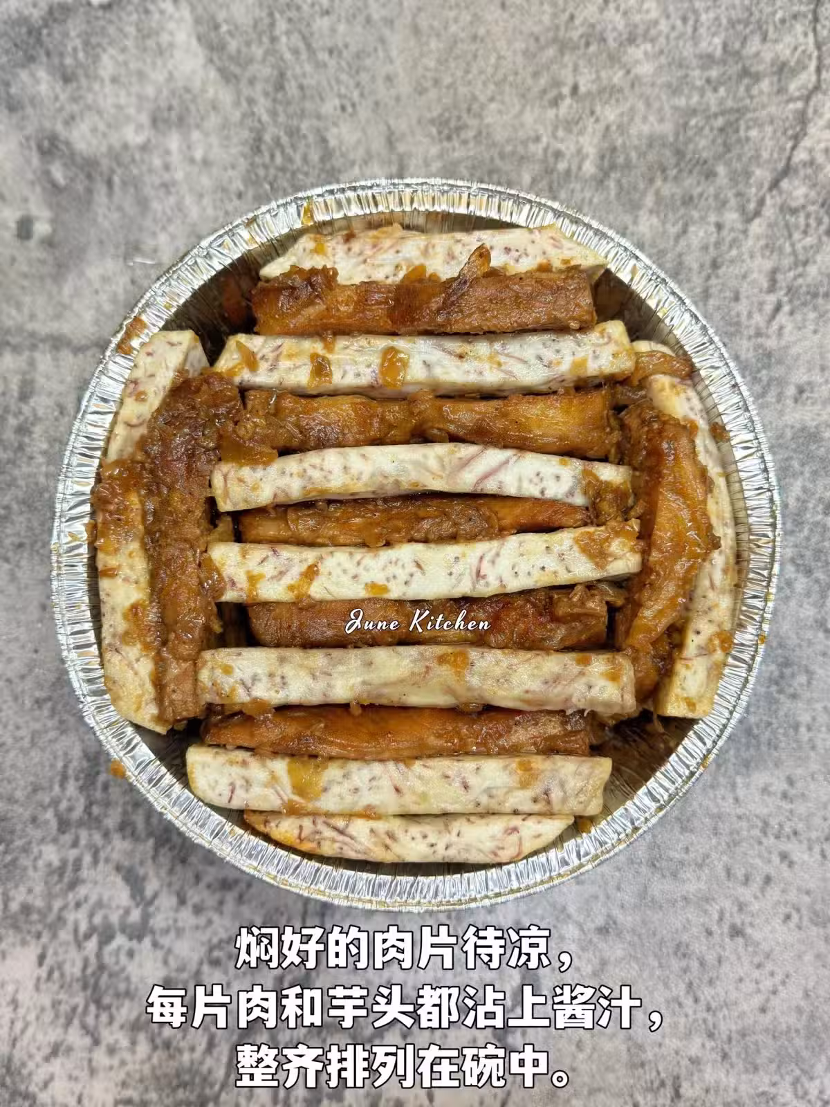 8️⃣燜好肉片的醬料是帶點濃稠度的。把剩餘的醬料,填入每片芋頭和肉之間。最後面上鋪上剩餘的醬料即可。