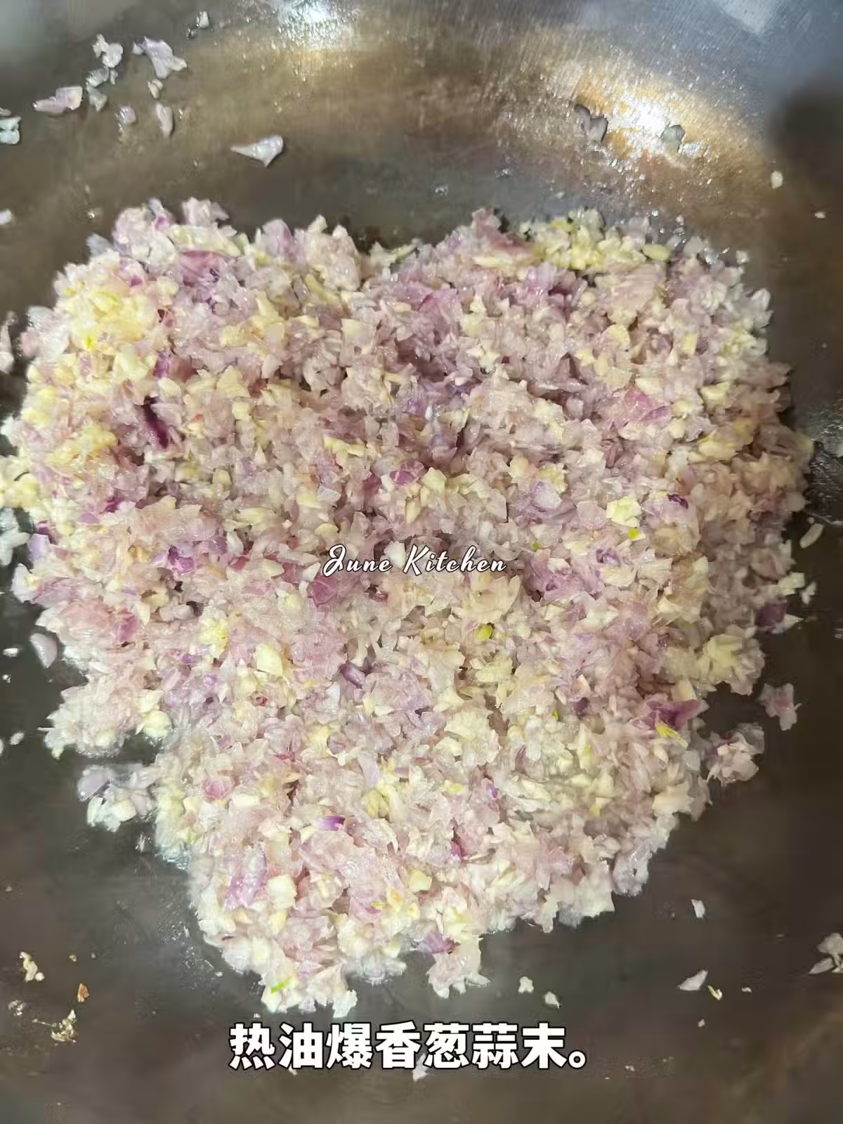 6️⃣熱油爆香蔥蒜末,爆香好的蔥蒜末,轉小火加入調味料攪拌均勻。加入熱水,煮滾的醬料加入三層肉,小火燜15分鐘。