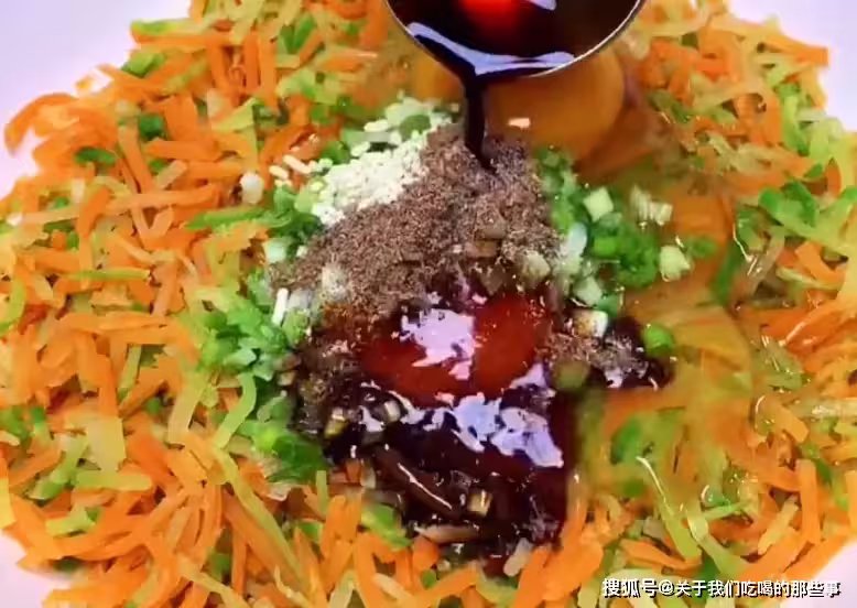 3、香菜摘洗乾淨後切末,香蔥剝洗乾淨後切蔥花,放入蘿蔔絲中,加入五香粉、香油攪拌均勻。這時候很多人都要加澱粉、麵粉了,都別加,那加啥?加一個饅頭,什麼?饅頭怎麼加?當然是揉碎了加。