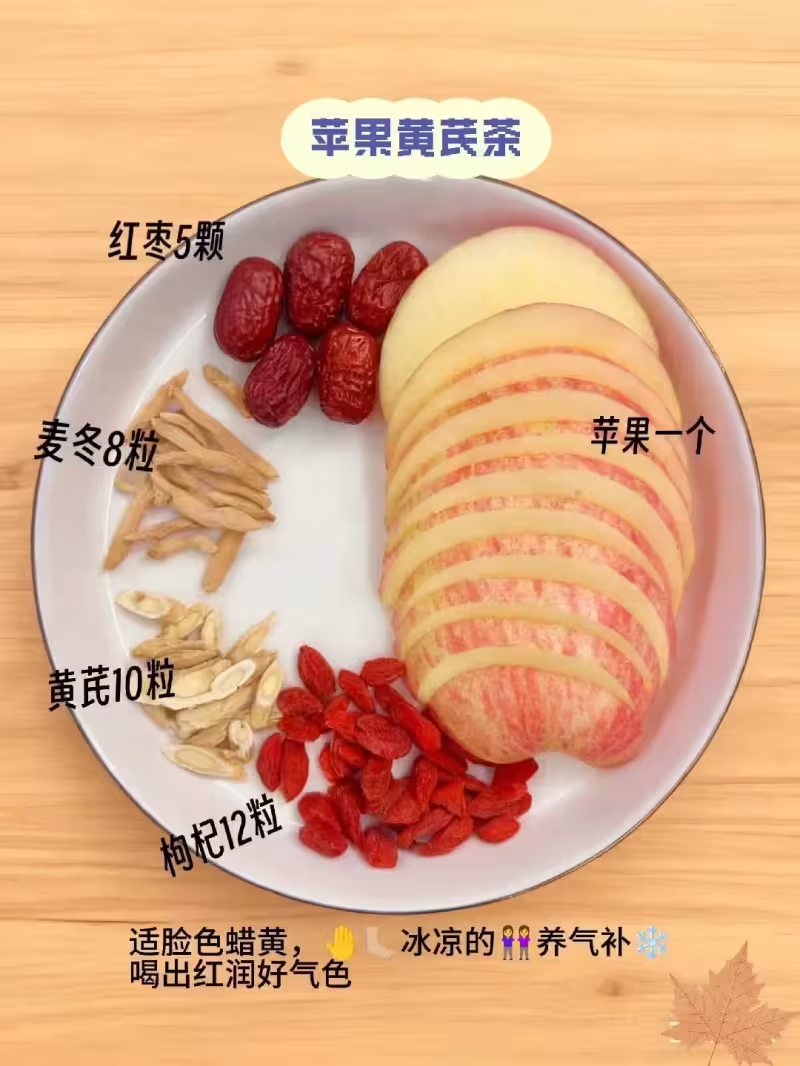 這個配方是李姐專門推薦給我的,她說我平時手腳容易冰涼,就該多喝這個,一個蘋果、黃芪10粒、枸杞12粒、麥冬8粒、紅棗5顆,黃芪要買那種切片的比較好煮,麥冬也是乾的那種,紅棗還是老樣子去核切開,蘋果切片後和黃芪麥冬一起先煮15分鐘,再放紅棗和枸杞煮10分鐘,煮出來的水有點淡淡的藥材香,但不會苦,喝完整個人從裡到外都暖暖的,我現在每天下午都會煮一壺,喝了兩周手腳確實沒那麼冰了,晚上睡覺也不用捂很久才暖和。