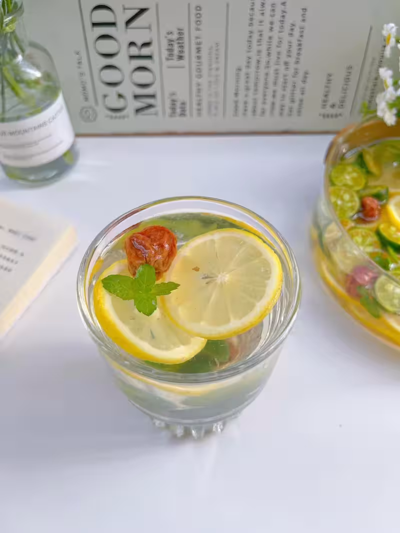2⃣️檸檬片+小青檸+話梅+薄荷+冰塊、倒入提前泡好的攤涼的茉莉花茶即可