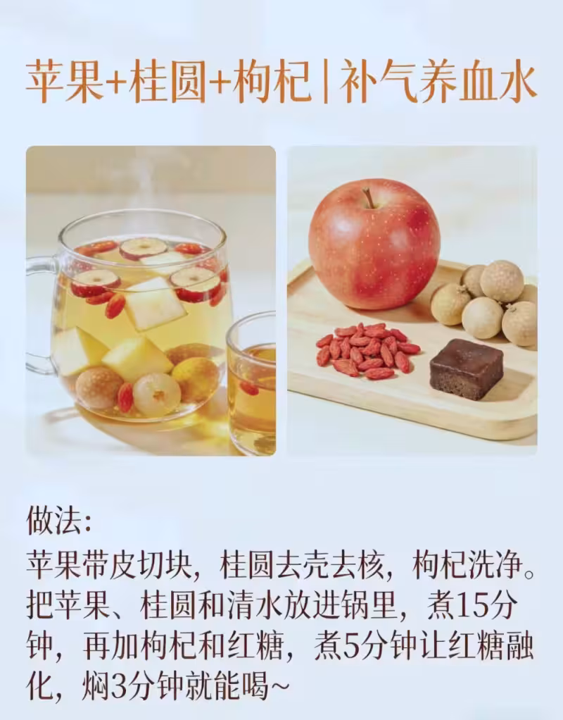 做法:蘋果帶皮切塊,桂圓去殼去核,枸杞洗凈。把蘋果、桂圓和清水放進鍋里,煮15分鐘,再加枸杞和紅糖,煮5分鐘讓紅糖融化,燜3分鐘就能喝~