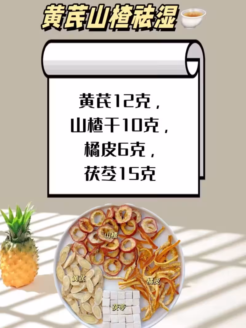 黃芪12克,山楂干10克,橘皮6克,茯苓15克