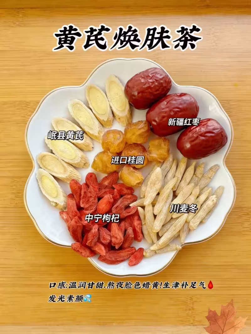 黃芪煥膚茶,6g岐縣黃芪、3顆新疆紅棗、5顆進口桂圓、一小把中寧枸杞,紅棗記得掰開去核,不然容易上火,黃芪片提前泡10分鐘,所有食材丟進杯子裡,開水衝下去燜15分鐘就能喝了,喝起來有點甜甜的,還有股淡淡的中藥香,我一般下午三四點的時候泡一杯,喝完整個人暖暖的,臉色看著也紅潤了些,熬夜後第二天喝一杯,氣色能好不少。