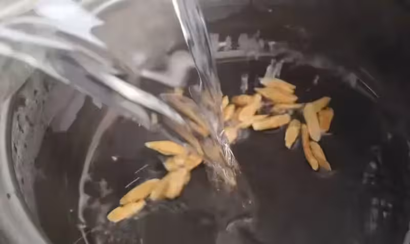 先準備十克左右的黃芪,清洗的時候可得注意了,一定要用涼水,而且清洗時間不能太久,不然黃芪里的營養成分很容易流失。黃芪看著乾淨,其實表面也有不少灰塵,用之前必須洗乾淨。洗乾淨後把黃芪撈出來,放進鍋里,加入 500 毫升左右的水。因為黃芪是干莖植物,要是煮的時間不夠,裡面的成分很難釋放出來,所以得先開大火把鍋煮開,再轉小火煮 10 到 12 分鐘。