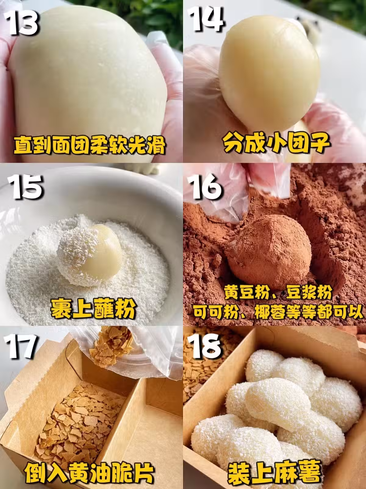 1。麵糰出鍋後趁熱加入玉米油融合、稍微放涼後再加水飴上手揉至光滑,過程需要5-10分鐘到完全變涼!時間不夠的話會出現各種問題!比如不夠勁道、蘸粉濕掉之類的!