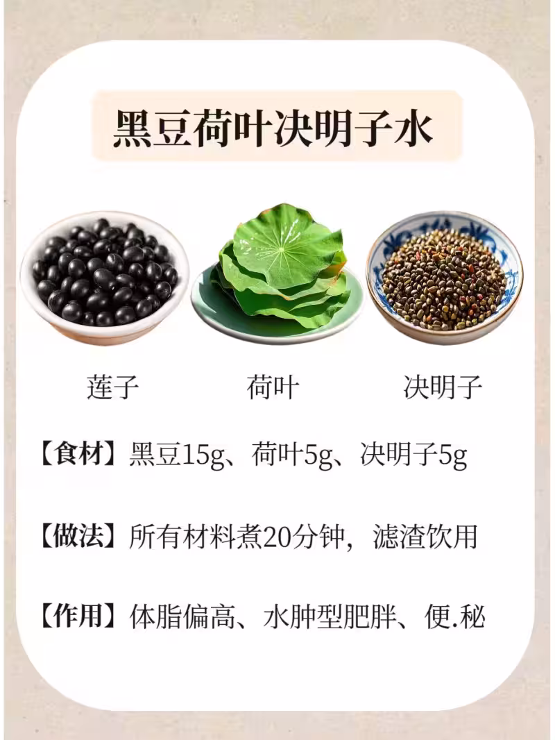 🍵【食材】:黑豆15g + 荷葉5g + 決明子5g
