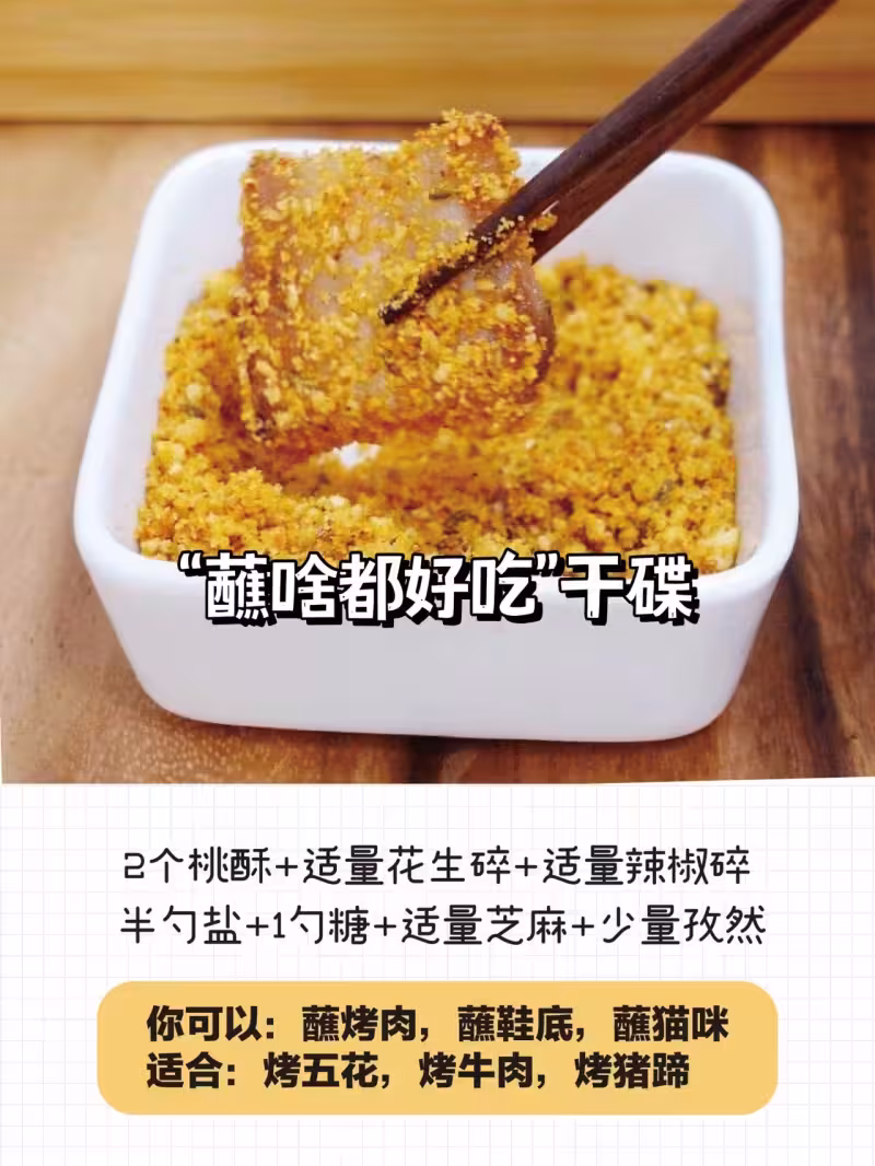 2塊桃酥+花生碎+芝麻+干辣椒粗碎+孜然粒+半勺鹽+1勺糖(全部攪碎)