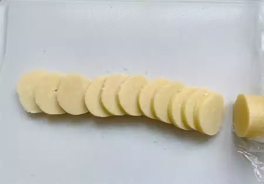 8、用刀切成厚薄均勻的小圓片,切的時候一定要厚薄均勻,否則烘烤的時候,薄的烤好了,厚得還不熟。