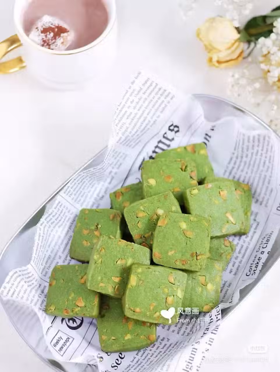 材料:低筋麵粉105g、抹茶4g、雞蛋1個、糖粉45g、黃油80g、開心果45g、全脂奶粉15g