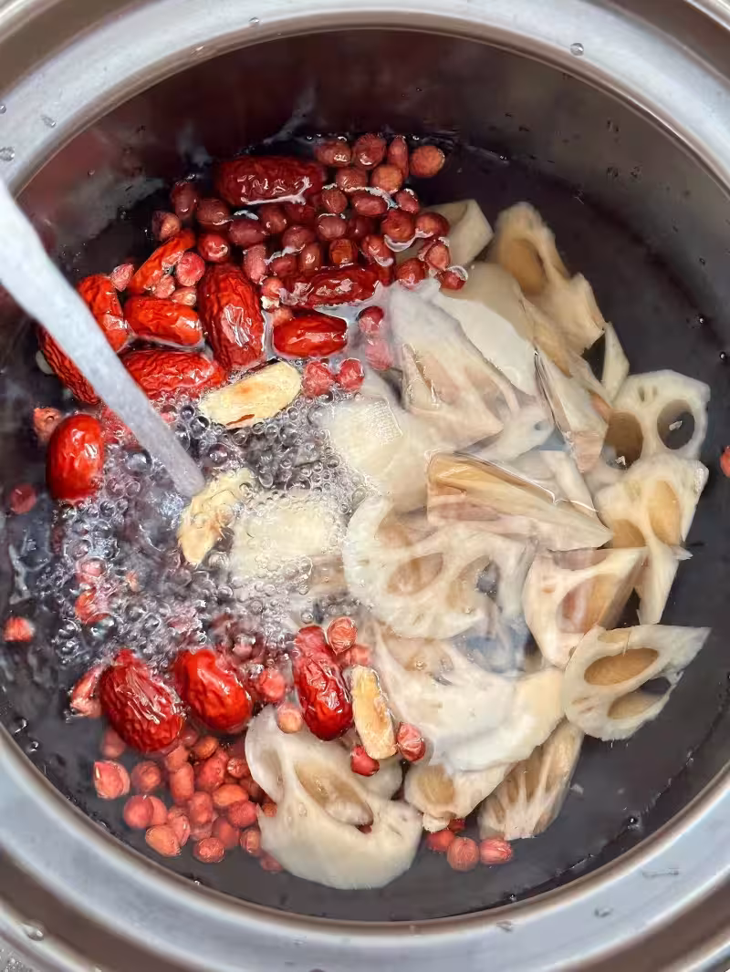 蓮藕花生紅棗湯,是王孟英提出的氣血清補方,蓮藕長在瘀土之中,既有溫和的土氣,又有清涼的土氣,滋陰養血,並且蓮藕還有很多孔,流通性很強,所以補而不滯,不會給脾胃增添負擔,虛不受補的姐妹,放心喝,煲湯/煮水喝都行(水開小火2小時為最佳)