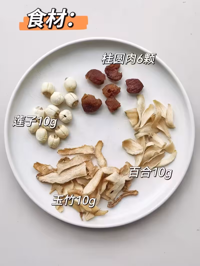 📖食材:桂圓肉6顆➕百合10g➕蓮子10g➕玉竹10g