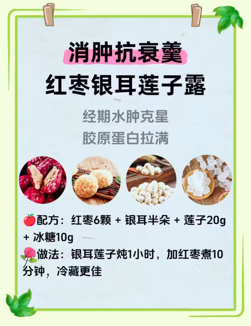 ✅ 做法:銀耳泡發撕小朵,和紅棗、蓮子一起煮30分鐘至軟爛,加冰糖調味即可。