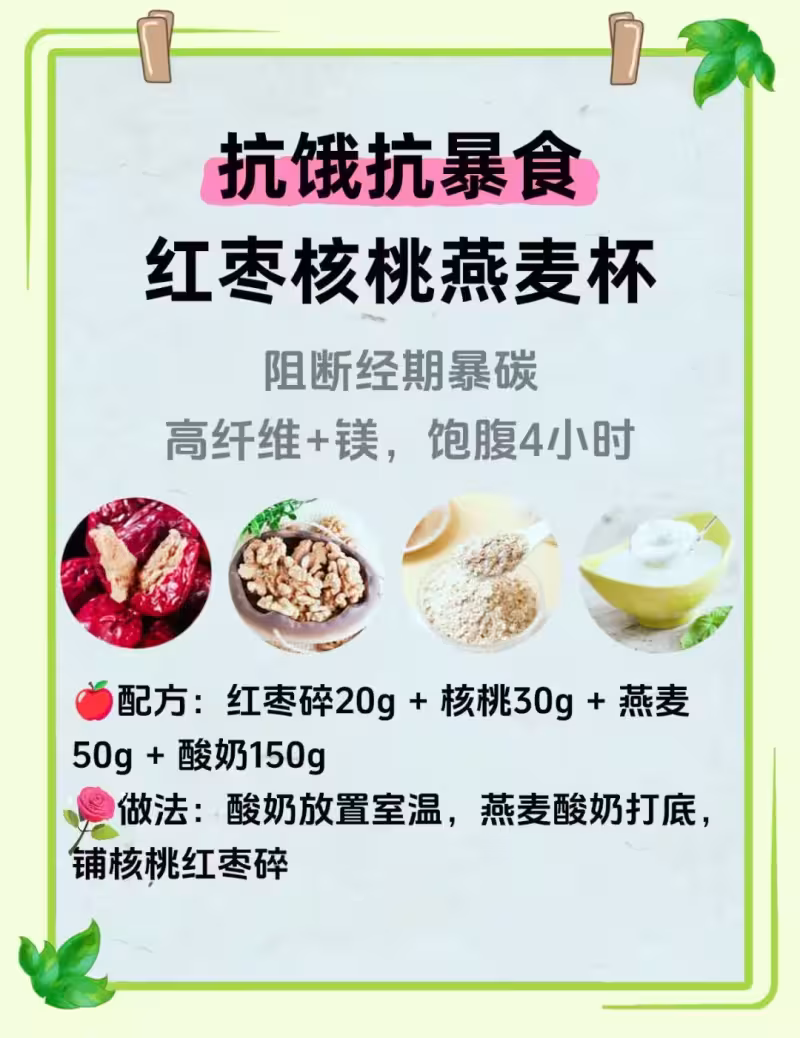 ✅ 做法:燕麥+溫牛奶沖泡5分鐘,撒上紅棗碎和核桃碎,攪拌均勻即可。
