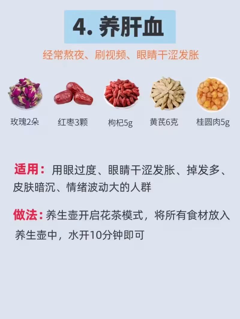 養肝血:玫瑰2朵+紅棗3顆+桂圓肉5g+枸杞5g+黃芪6g