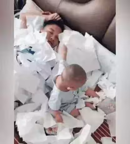 爸爸們帶娃就是這麼任性,只要孩子不哭,只要不耽誤我睡覺,不就是一捲紙麼,隨便撕,小樣,你個小奶娃還能翻天不成?
