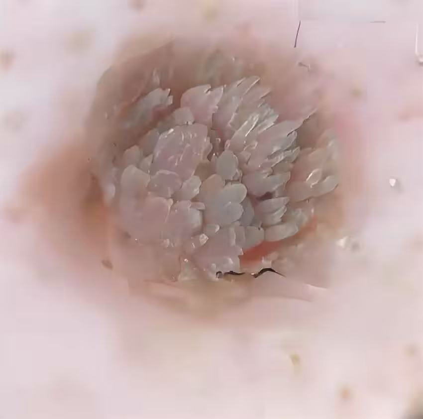 皮膚科診室里,當醫生用手術剪小心剪開硬塊表層時,