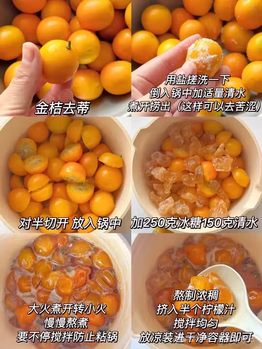 2️⃣ 金桔對半切開,倒入鍋中加清水加冰糖大火煮開,轉小火慢慢熬煮,需要不停攪拌防止粘鍋底,熬制濃稠擠入半個檸檬汁提亮易保存。