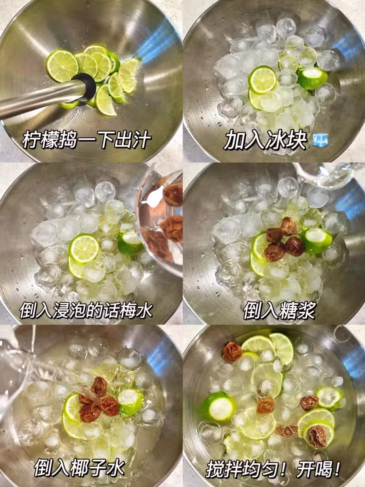 2️⃣檸檬搗一下出汁,裝滿冰塊、倒入浸泡的話梅水 、糖漿和椰子水!再加幾顆話梅、最後攪拌均勻即可✅
