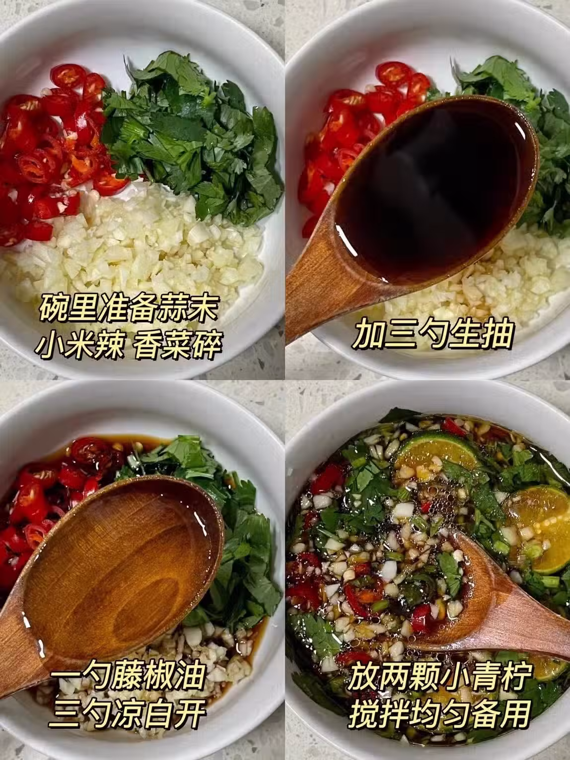 1️⃣醬汁:碗里放蒜末、小米辣、香菜碎,加3勺生抽,1勺藤椒油,3勺涼白開,2顆小青檸拌勻備用