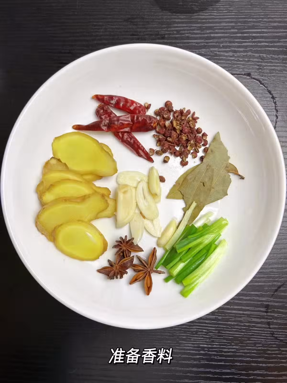 準備香料:蔥、姜、蒜、干辣椒、花椒、八角、香葉