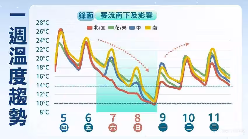 中央氣象署提醒,明天(7日)寒流南下,全台明顯轉冷。