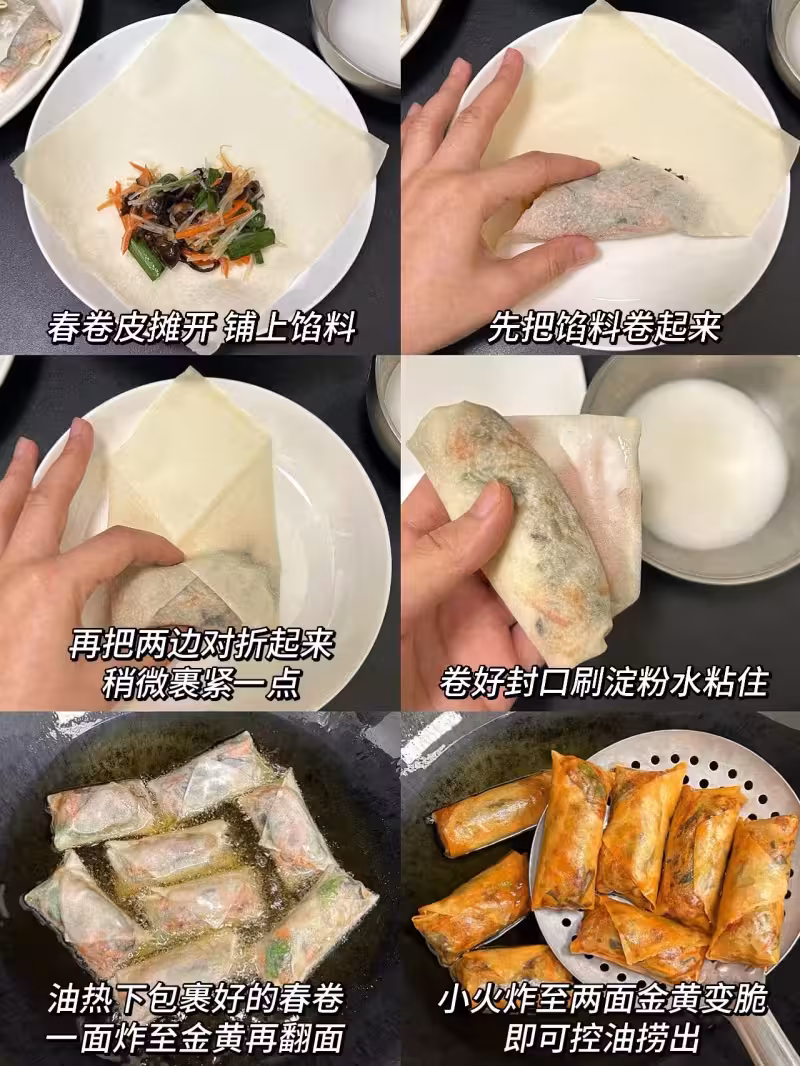 🌟春卷皮薄薄的很容易熟,封口沾澱粉水下鍋才不會散!全程中小火慢炸,變黃變脆就ok~