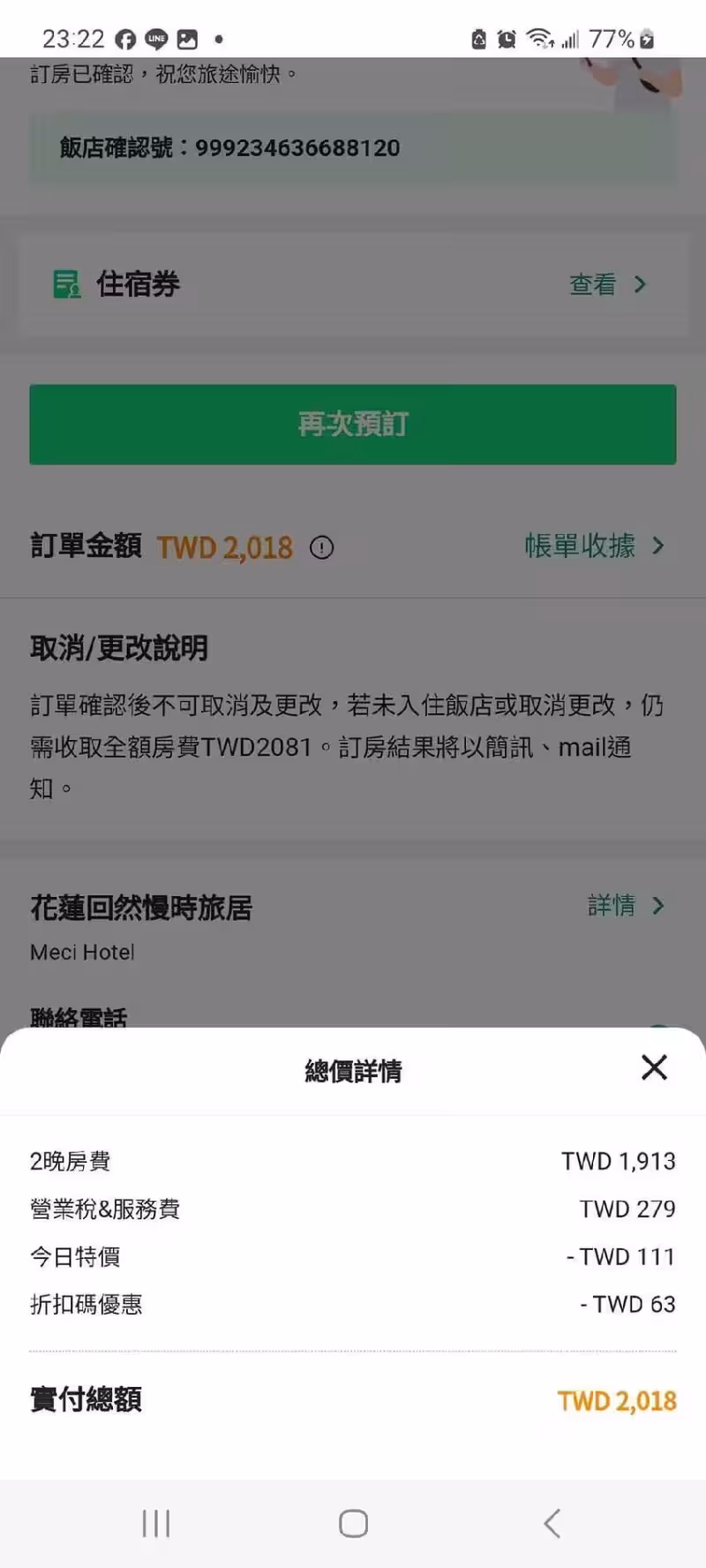 投宿某飯店住雙人房,2天房費竟只要2018元,使用住宿補助後實付僅18元,雖然沒有早餐跟浴缸,