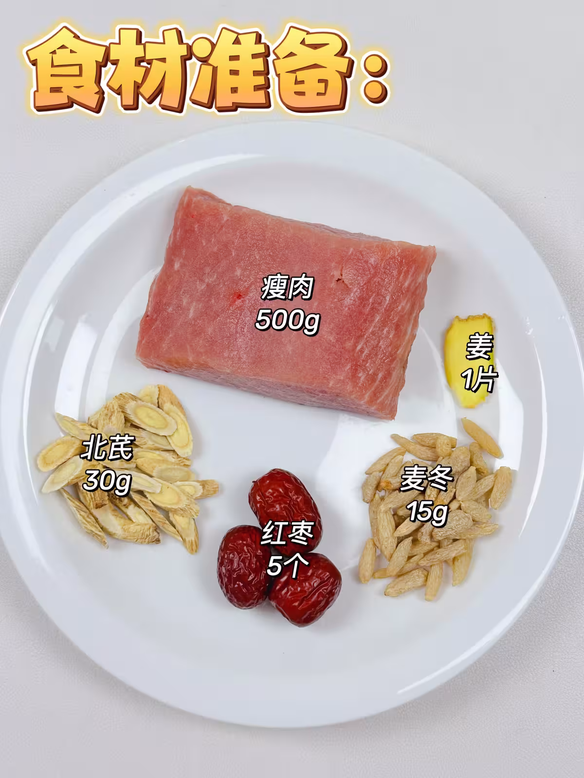 瘦肉500g、北芪30g、麥冬15g、紅棗5個、姜1片